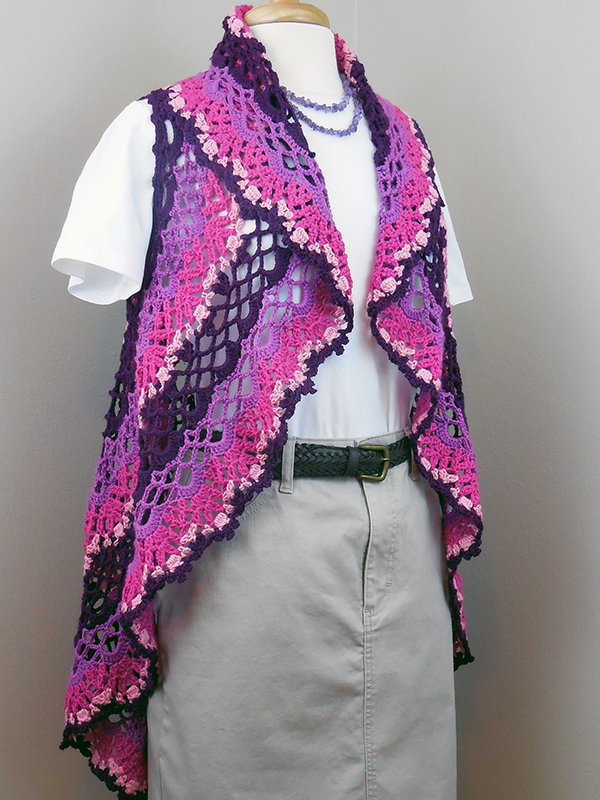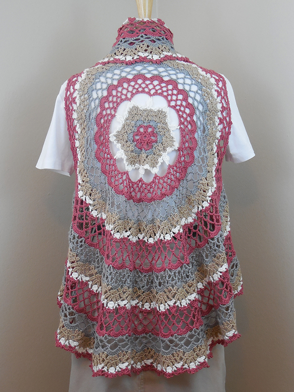 Concentric lacey patterns create this fun boho-style circle vest. The various sizes are established on the armhole opening round and three different lacy borders are included to change the final diameter of the vest. Instructions are also provided to create a lacy doily by eliminating the armholes.